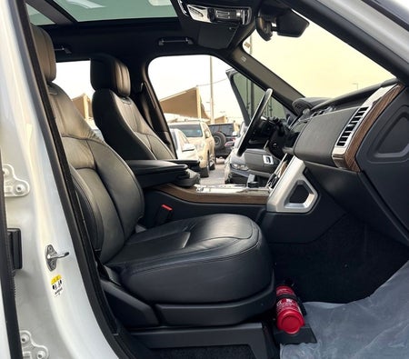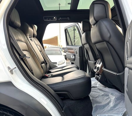 Range Rover Vogue Supercharged 6cylinder Gulf, number one, full specifications, panoramic, leather, large screen, camera, fingerprint start, and blind spot. The car has only one piece of paint. The car is white with a black interior.