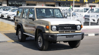 New Toyota Land Cruiser LX for sale from Najem Motors in Dubai. Beige model. The car has manual gearbox, cylinder engine, ″ wheels and grey interior. GCC specs.