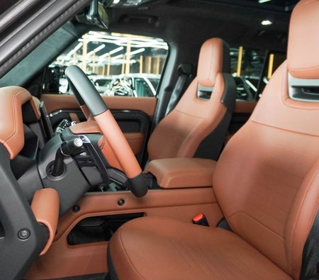 Brand new Land Rover Defender for sale in Dubai. Grey model, available at Najem Motors. This car has automatic transmission, cylinder engine, ″ wheels and tan interior. European specs.
